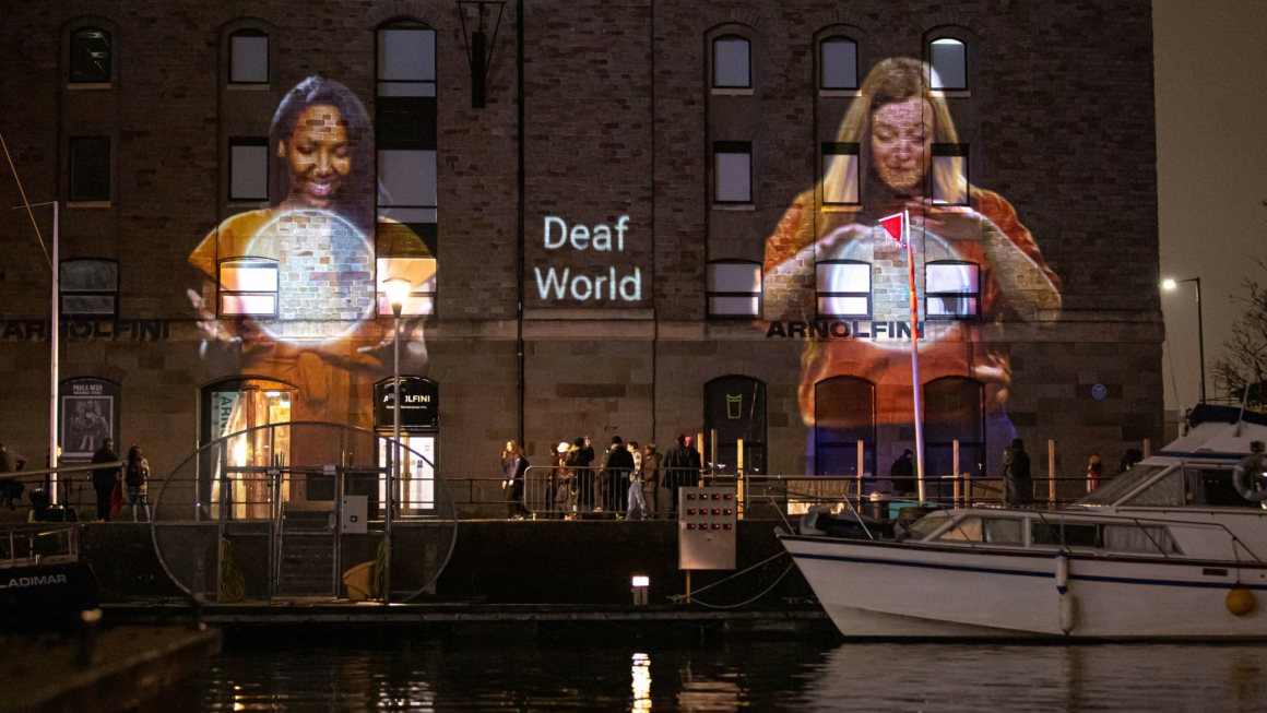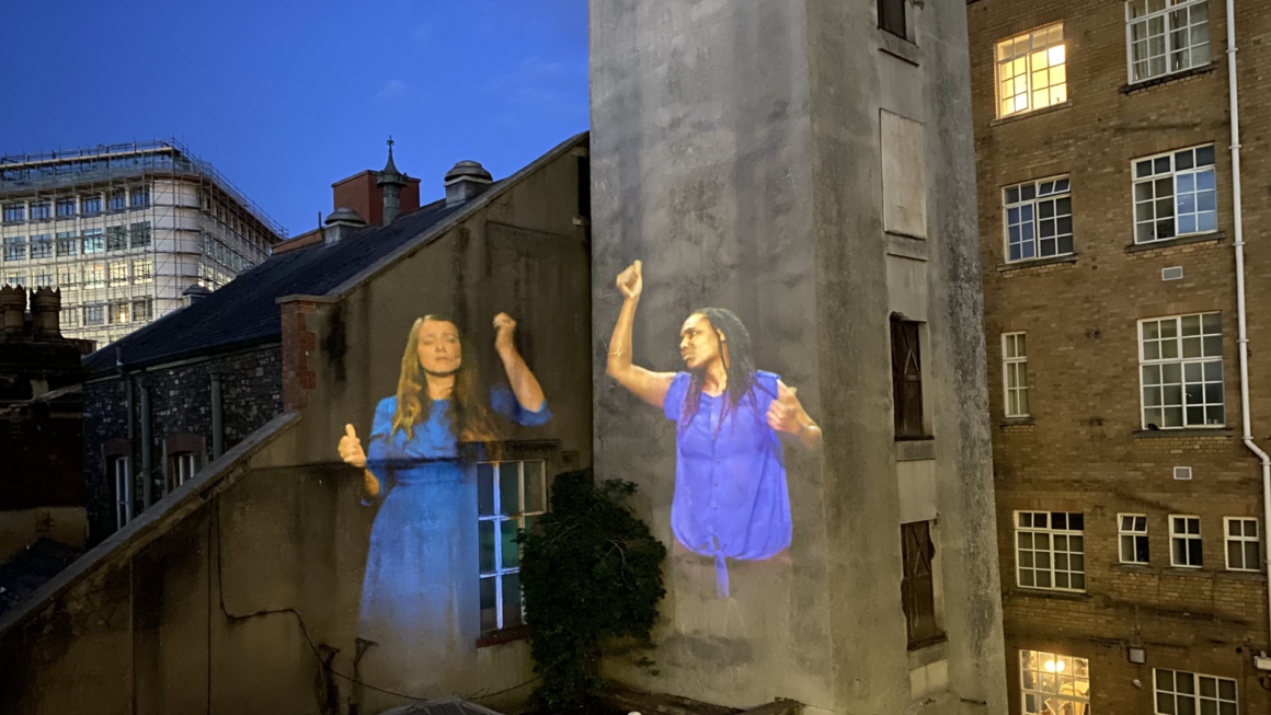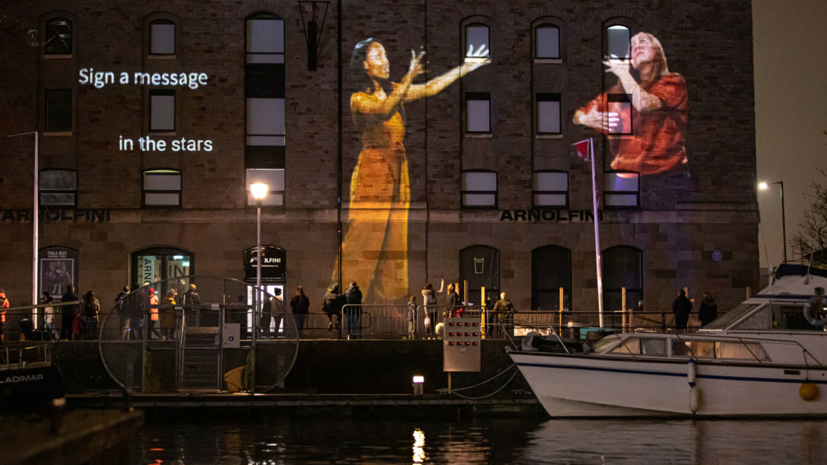 Cathy Mager / Großbritannien 2020 / 6:30 min / Omd/eU (SDH)Träume für die Zukunft, Botschaften an den Nachthimmel: Die gehörlose britische Künstlerin Cathy Mager inszeniert ein poetisches Zwiegespräch zweier Liebender in britischer Gebärdensprache als raumgreifende Projektion auf Gebäude im Zentrum von Bristol. Die faszinierende Installation – der Abschluss eines sehr aufwändigen Entstehungsprozesses in durch den Lockdown erzwungender Distanz – untersucht Kommunikationsbarrieren, die durch das Tragen von Masken entstehen, und die soziale Isolation, die viele gehörlose Menschen während der COVID-19-Pandemie erlebt haben.