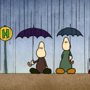 Drei Männer stehen im Regen und warten auf den Bus. Ihre Regenschirme scheinen dabei ganz besondere Kräfte zu entfalten.